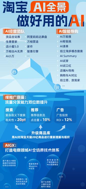 会上,阿里巴巴中国电商事业群搜推智能总裁凯夫表示,“「好用的AI」是淘宝AI应用的检验标准,我们希望AI能解决消费痛点,也能让商家获得增长。”为此,平台通过AI对20亿商品进行更精准理解与组织,实现流量匹配效率双位数增长:包括复杂语义下搜索相关性提升20个百分点,推荐信息流点击量提升10%,商家广告ROI提升12%。