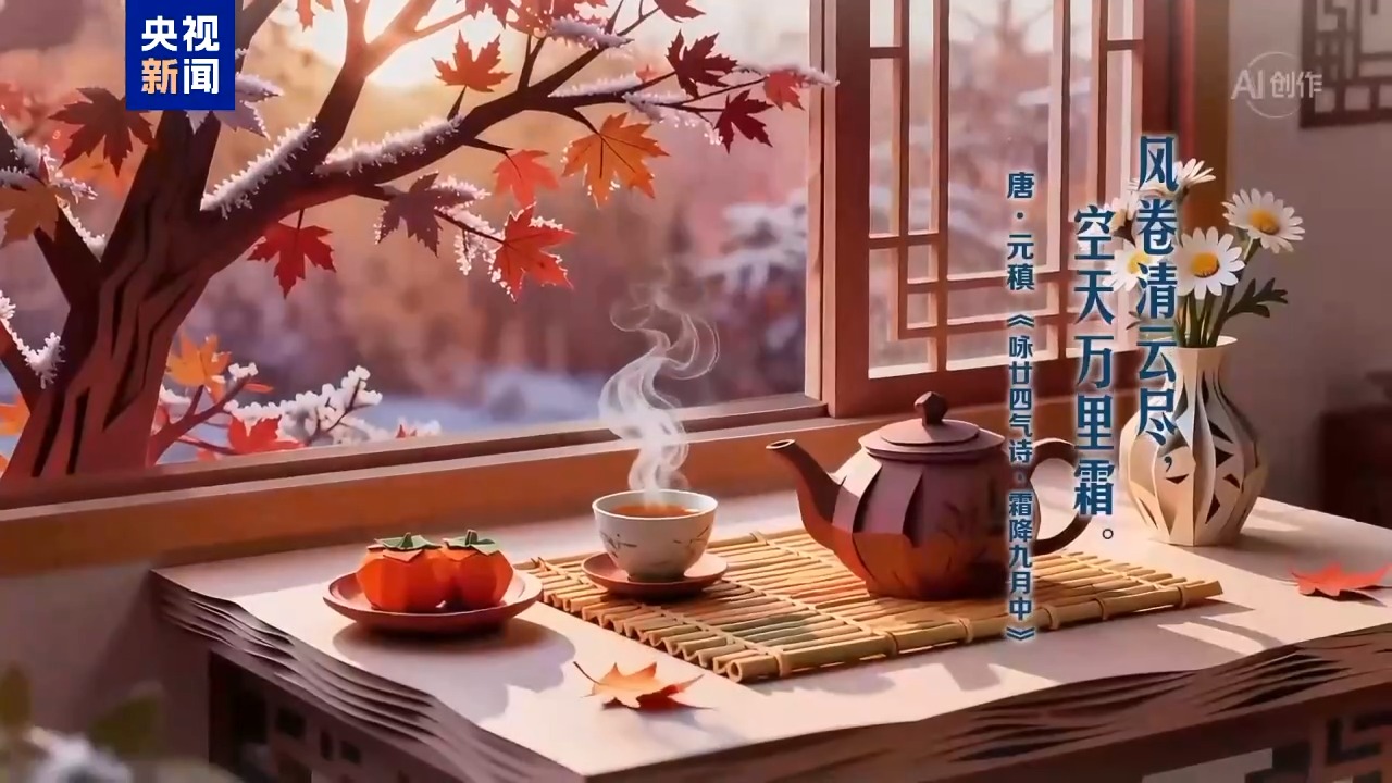 霜华点染,别有清韵。田野间,农人正争分夺秒收、耕、播、栽,充实仓廪,守护丰饶。漫步山林,看经霜浸染的枫叶燃尽最后的炽烈,松柏愈显苍翠挺拔。赏菊饮酒,食肉温补,尝一口香甜软糯的柿子,咬一口清甜多汁的秋梨,围炉小聚,任暖意从舌尖漫至心底。